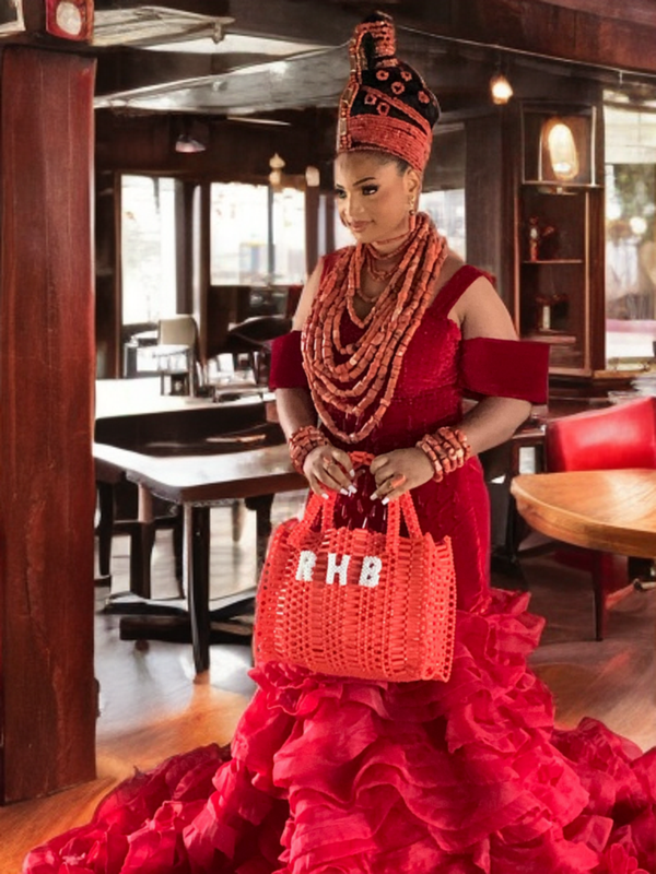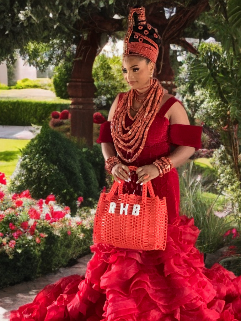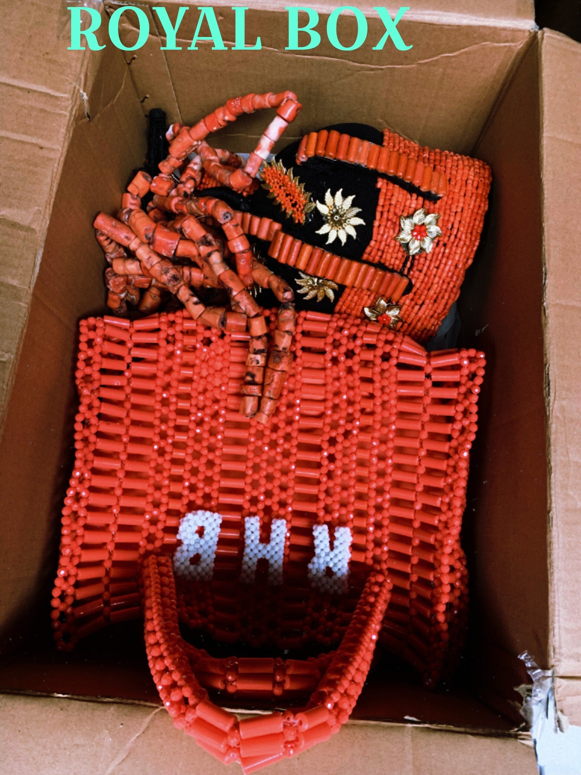 SPECIAL OFFER, THE ROYAL BOX,A COMPLET ROYAL PRINCESS ATTIRE, Ewu-ivie, a beaded CROWN 👑 or blouse. Edo women adorn their necks with beads known as Ivie-uru and wear the Ivie-obo on their hands and beaded earrings = €6750,67